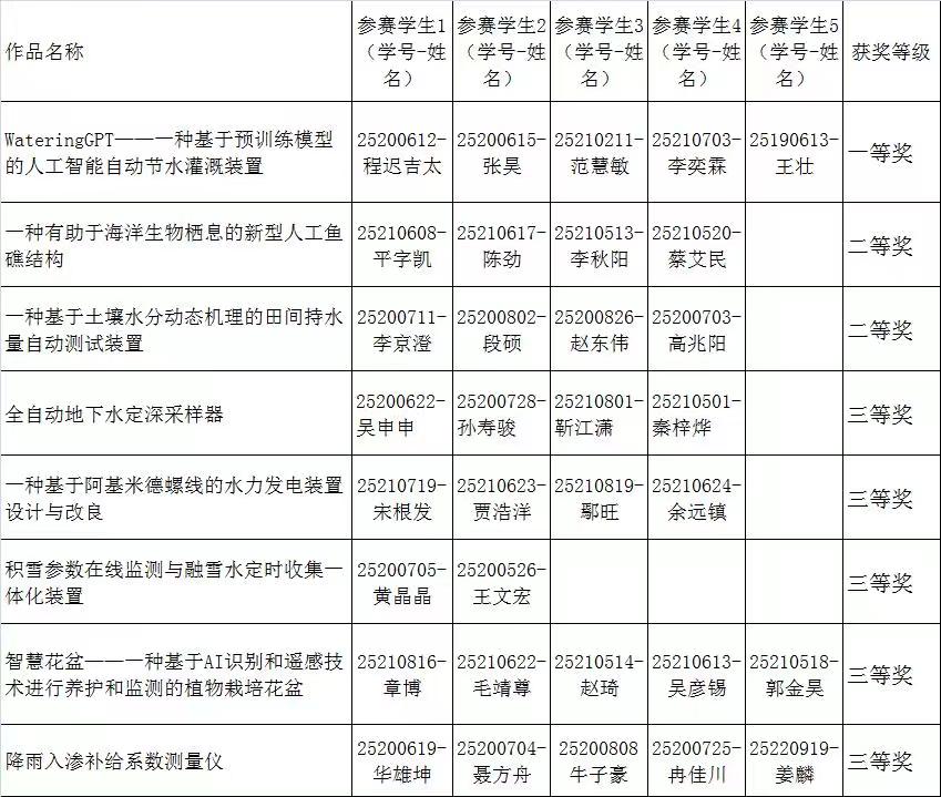 根据《关于举办第八届全国大学生水利创新设计大赛的通知》(水教协[2023]11号)要求,无码流出 于2023年4月28日组织了水利创新设计大赛院赛,对本次申报的8个作品进行了评审,确立一等奖1项,二等奖2项,三等奖5项,推荐《WateringGPT——种基于预训练模型的人工智能自动节水灌溉装置》、《一种有助于海洋生物栖息的新型人工鱼礁结构》、《一种基于土壤水分动态机理的田间持水量自动测试装置》三项作品参加国赛,现予公示,公示时间2023年4月28日至5月4日,如有异议,请拨打电话88502167。