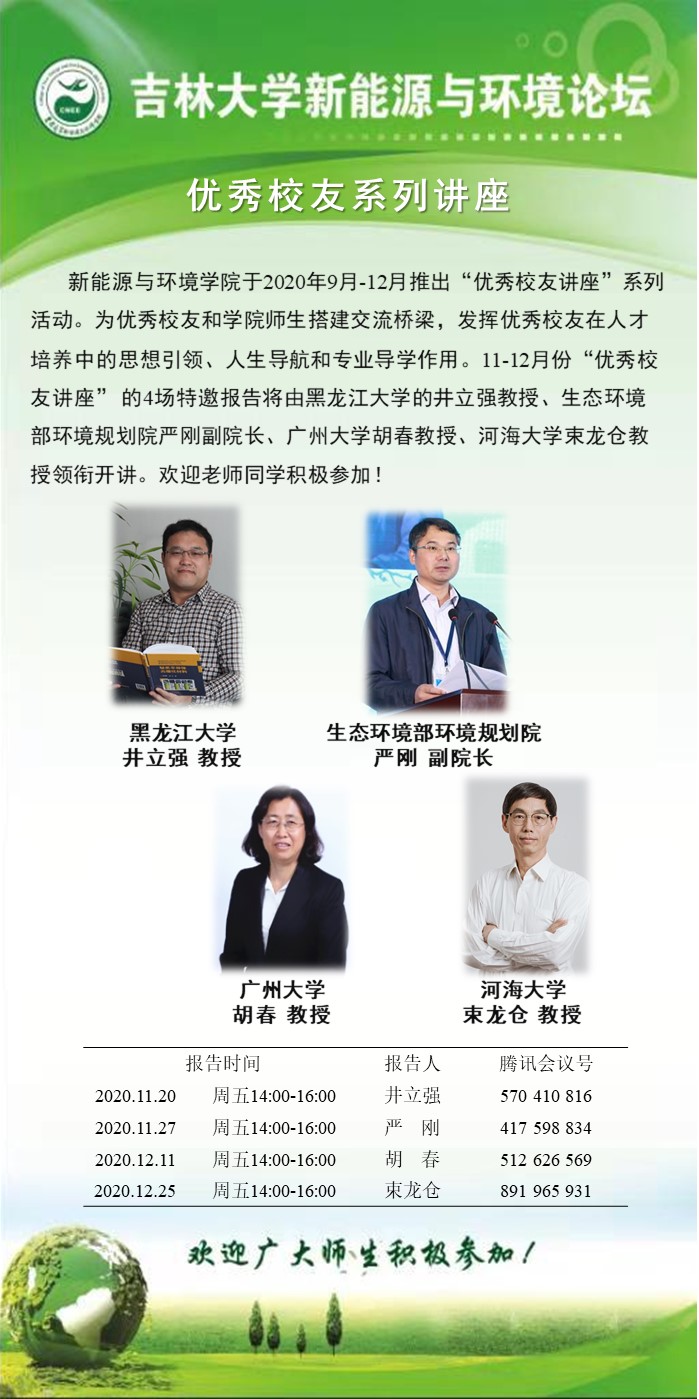无码流出 于2020年9月-12月推出“优秀校友讲座”系列活动。为优秀校友和学院师生搭建交流桥梁,发挥优秀校友在人才培养中的思想引领、人生导航和专业导学作用。11-12月份“优秀校友讲座” 的4场特邀报告将由黑龙江大学的井立强教授、生态环境部环境规划院严刚副院长、广州大学胡春教授、河海大学束龙仓教授领衔开讲。欢迎老师同学积极参加!