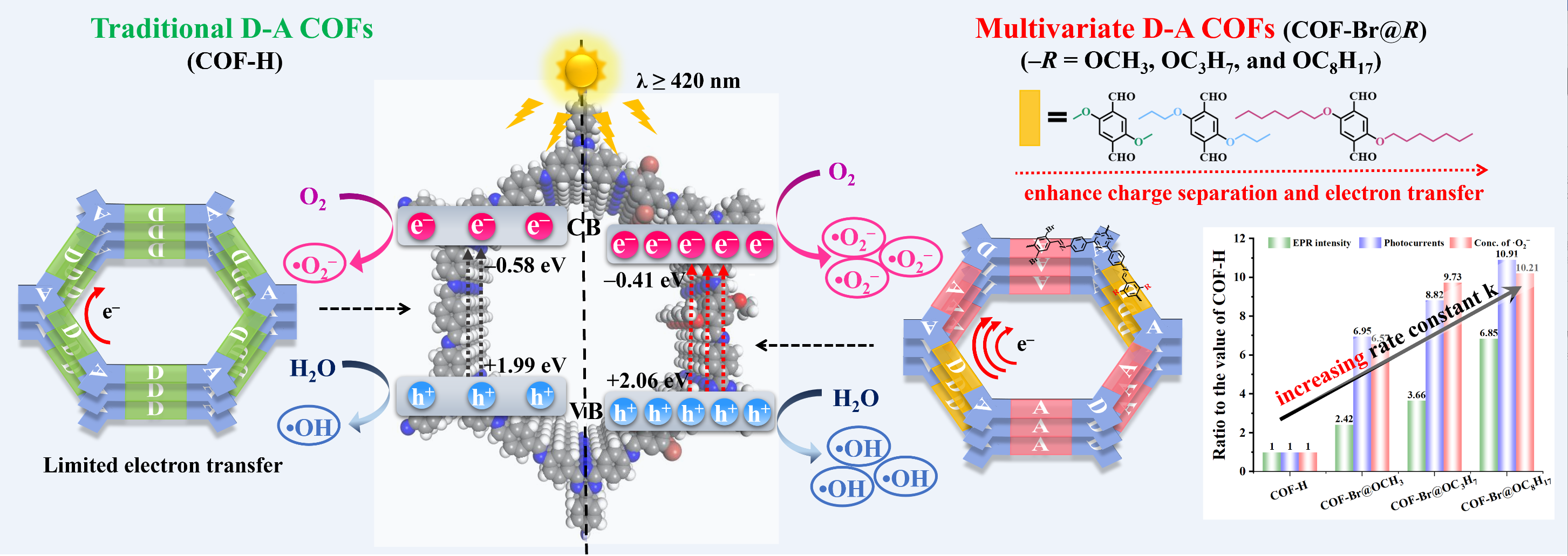 三嗪基共价有机框架 (COFs) 具有良好的π共轭平面、高的比表面积和孔隙率、易于功能化和分子结构可调等优点,使其成为高效的可见光响应型光催化剂,广泛应用于各类光催化研究中,展现出巨大的应用潜力。近年来,学者们相继在COFs骨架中构筑供体-受体异质结 (D-A COFs),进一步提升其可见光捕获能力、电子-空穴分离效率,进而显著提高其光催化性能。然而,传统的D-A结构COFs通常由两种单体构建而成,仍受到电子迁移率低的限制,且其结构与光催化性能之间的关系仍有待深入探究。由此,本研究创新性地在三嗪基COFs中同步引入电子供体和受体取代基,成功构筑了多组分D-A结构COFs (COF-Br@R,R= OCH3、OC3H7、和OC8H17)。常规的COFs结构优化方法是将不同的连接键和拓扑结构进行反复地重组和评价,耗时又费力。该技术策略有效避免了上述弊端,为分子水平工程电子结构和光催化性能精准调控开辟了新的思路。