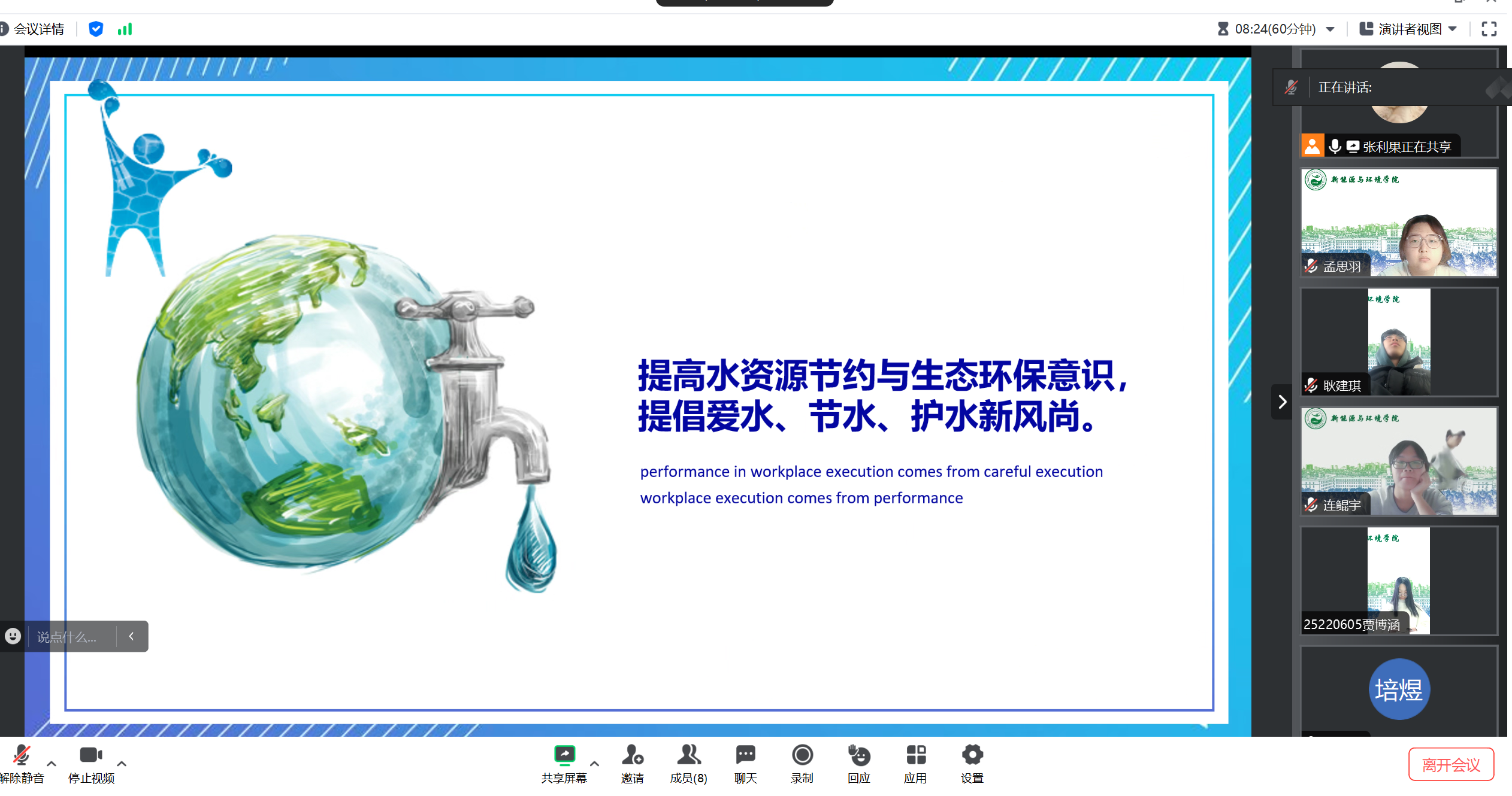 部分团支书带领团支部同学讨论为什么要节约用水,如何节约用水等,阐述节约水资源在中国绿色可持续发展中的重要性。同学们就中国绿色可持续发展的政策已经水资源规划与管理进行了思考与讨论。