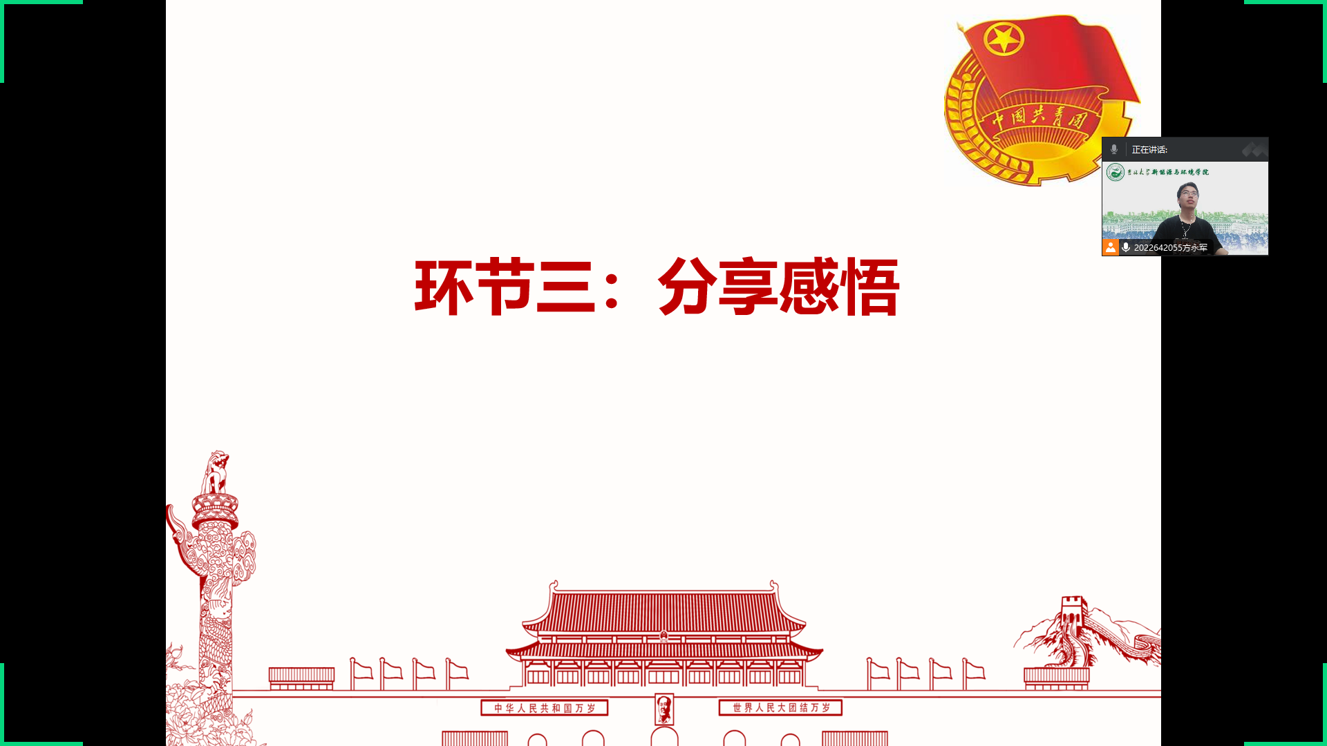 然后,团支部书记播放了由联合国环境规划署合作的公益广告:《被塑料毁掉的家园》。本片跟随一个孩子的视角,通过她用塑料瓶制成的望远镜观察我们被塑料污染的未来,希望可以提高人们的认识并推动采取行动结束全球的塑料污染。