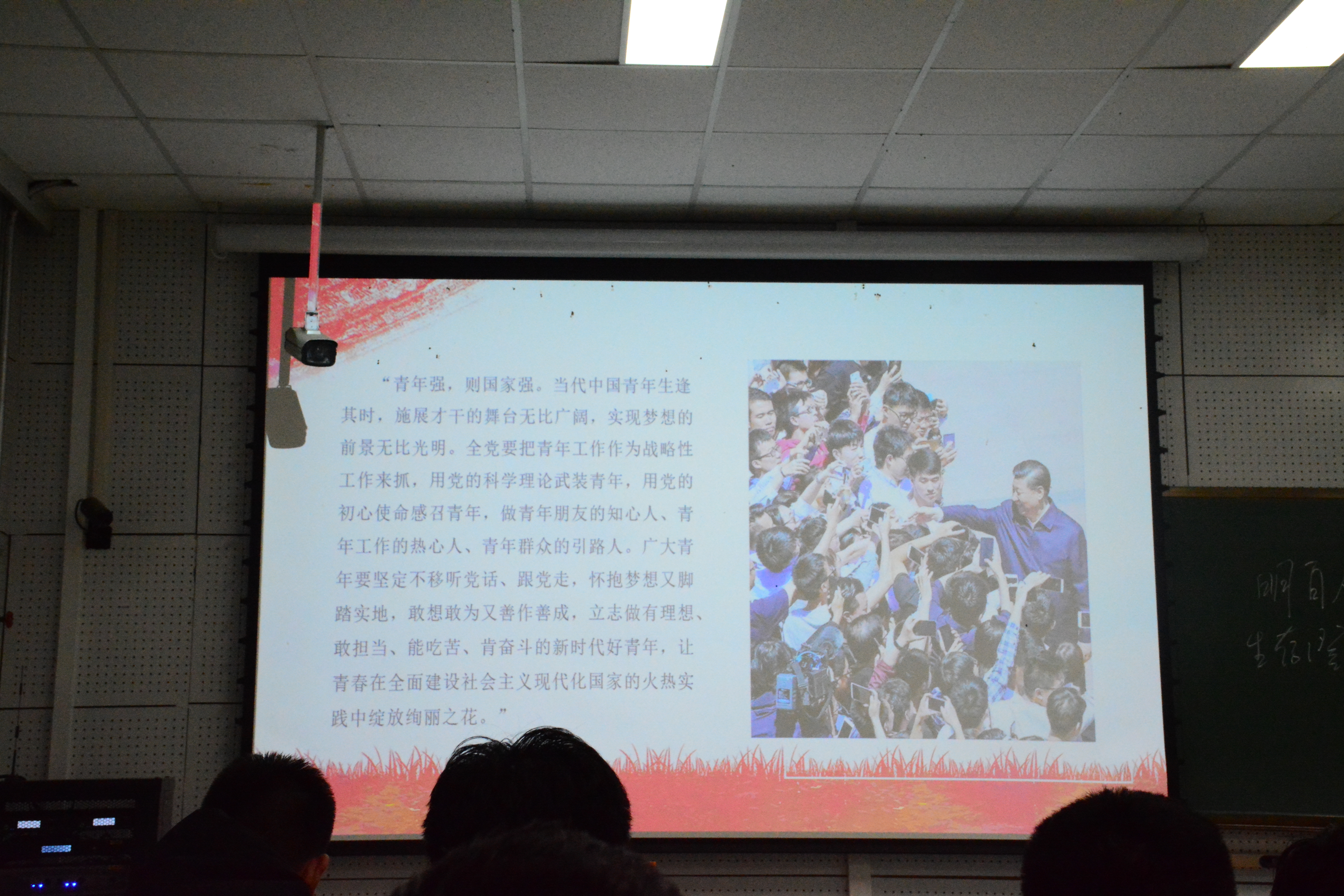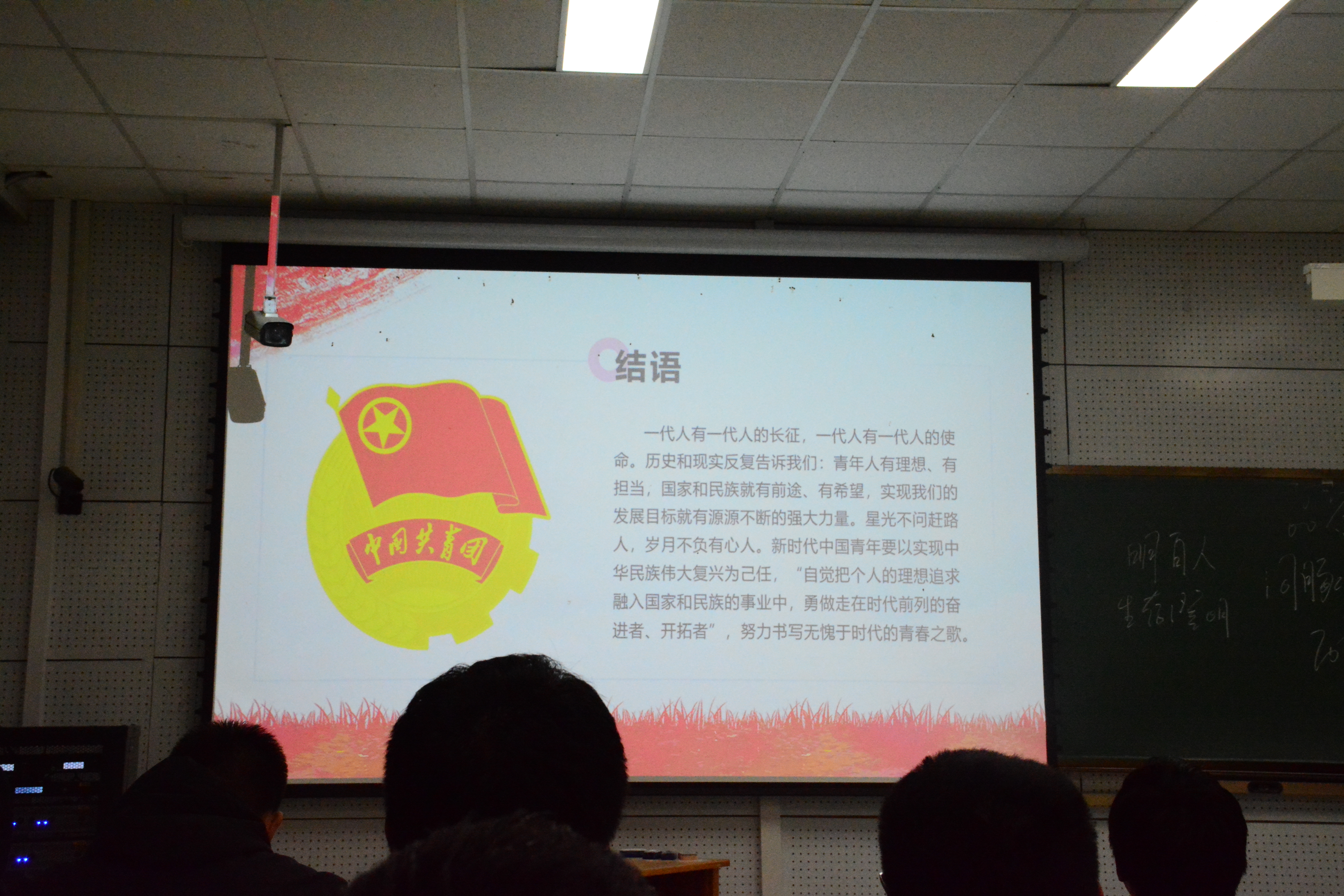 此后,支继超老师从四个部分层层深入,介绍团的十九大精神,给在座的同学们上了一场生动、深刻的思想课。支老师强调,“中国共产主义青年团是中国共产党领导的先进青年的群团组织”,入团不仅仅是政治面貌的改变,更应是追求思想进步的第一步。同时支老师也提到,入团是一个从自觉到自为的过程,也是一个主动追求进步的过程。