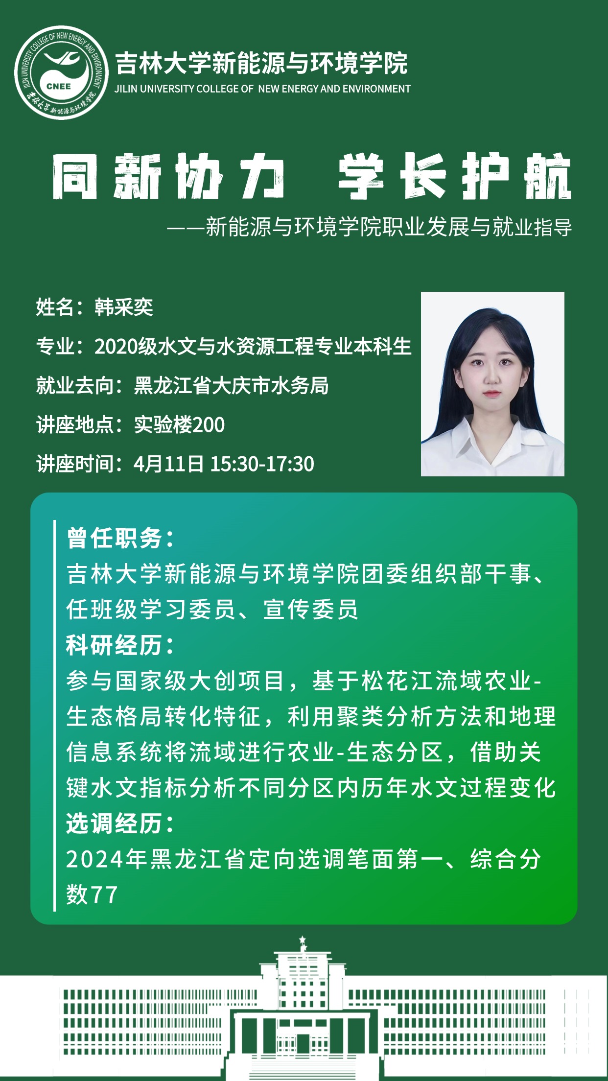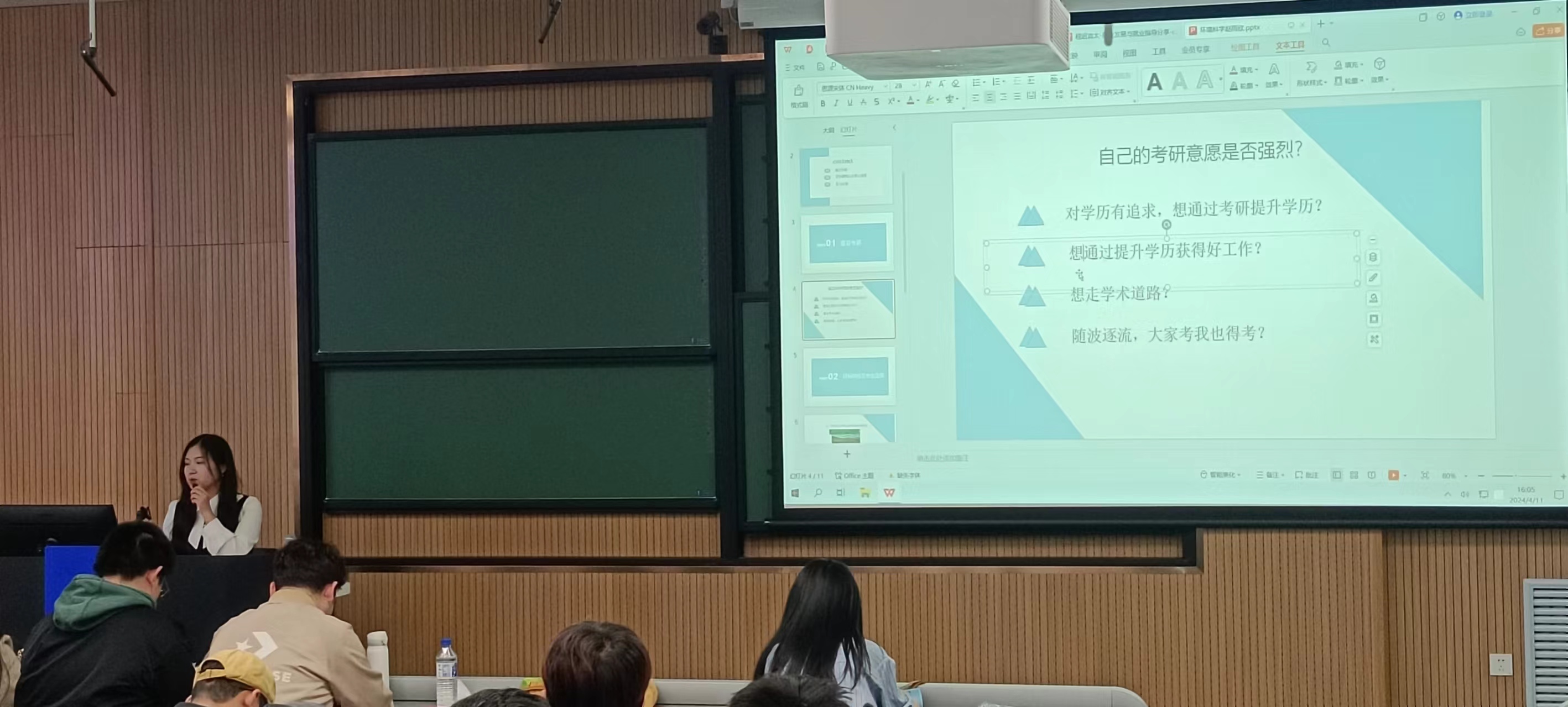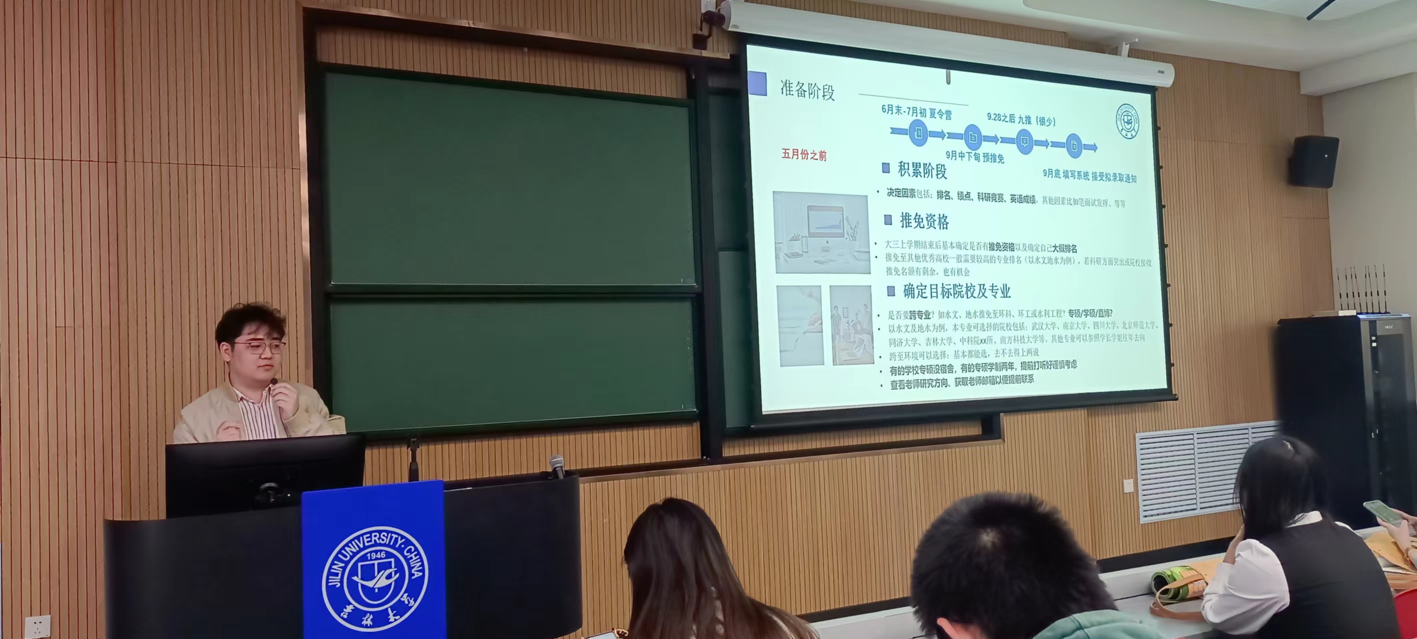 本次活动主讲人为四名2024年优秀应届毕业生。水文与水资源工作专业韩采奕同学在2024年黑龙江省定向选调考试中笔试、面试均列第一,成功上岸黑龙江省大庆市水务局;地下水科学与工程专业程迟吉太,于2023年成功推免至南京大学地球科学与工程学院;环境科学专业赵雨欣2024考研分数417分,为无码流出