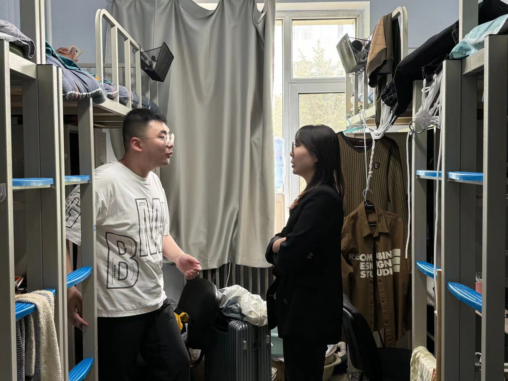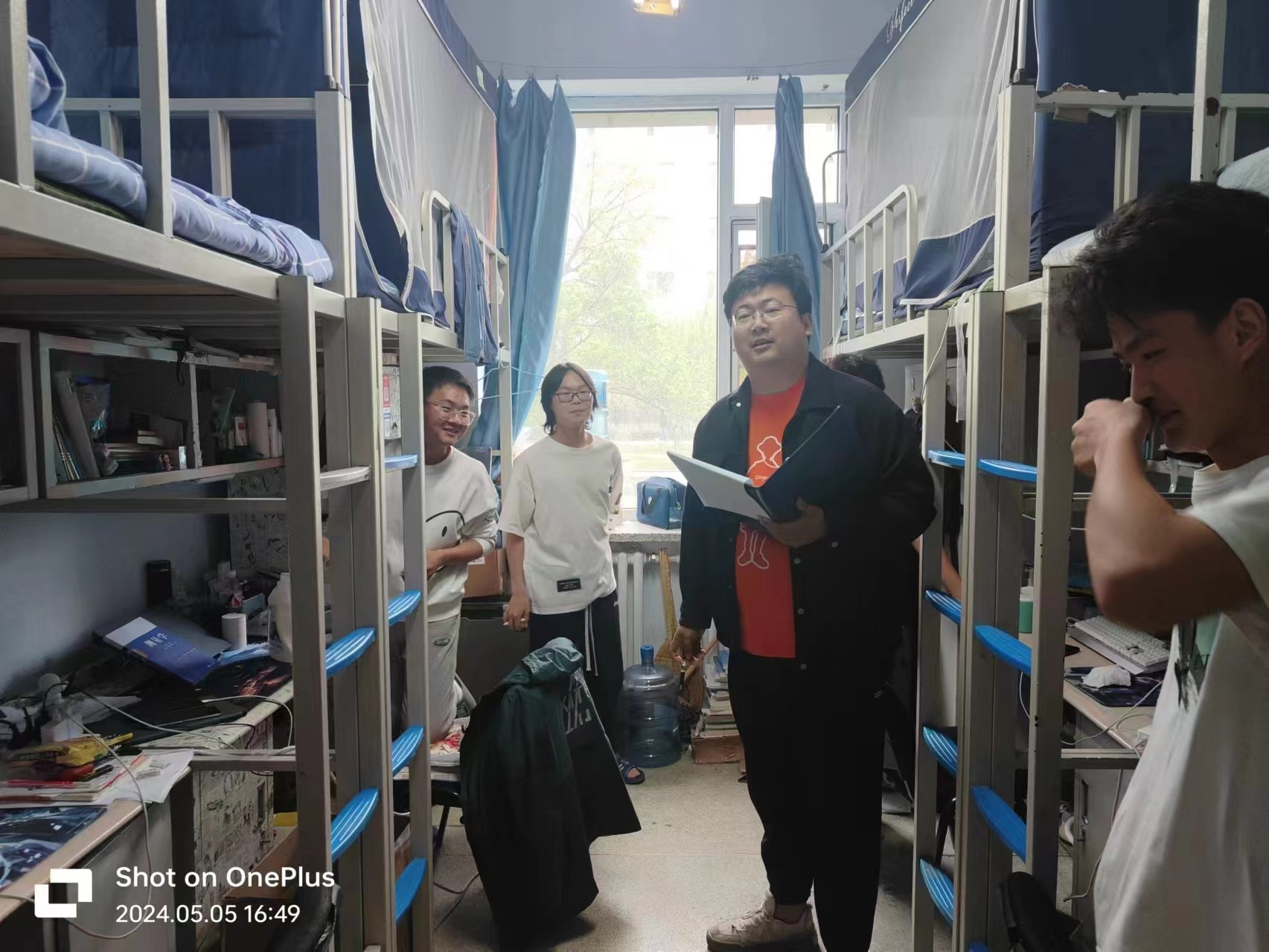 5月6日,2023级辅导员姜岳彤老师对南苑二公寓21间寝室进行走访,了解学生假期后心理动态及宿舍卫生情况,并检查充电器等安全隐患问题,未发现违纪情况。10日,姜老师深入《大学物理BI》课程,同任课老师沟通教学进度及签到情况,本次课程共1人请假,其余同学均按时到课。