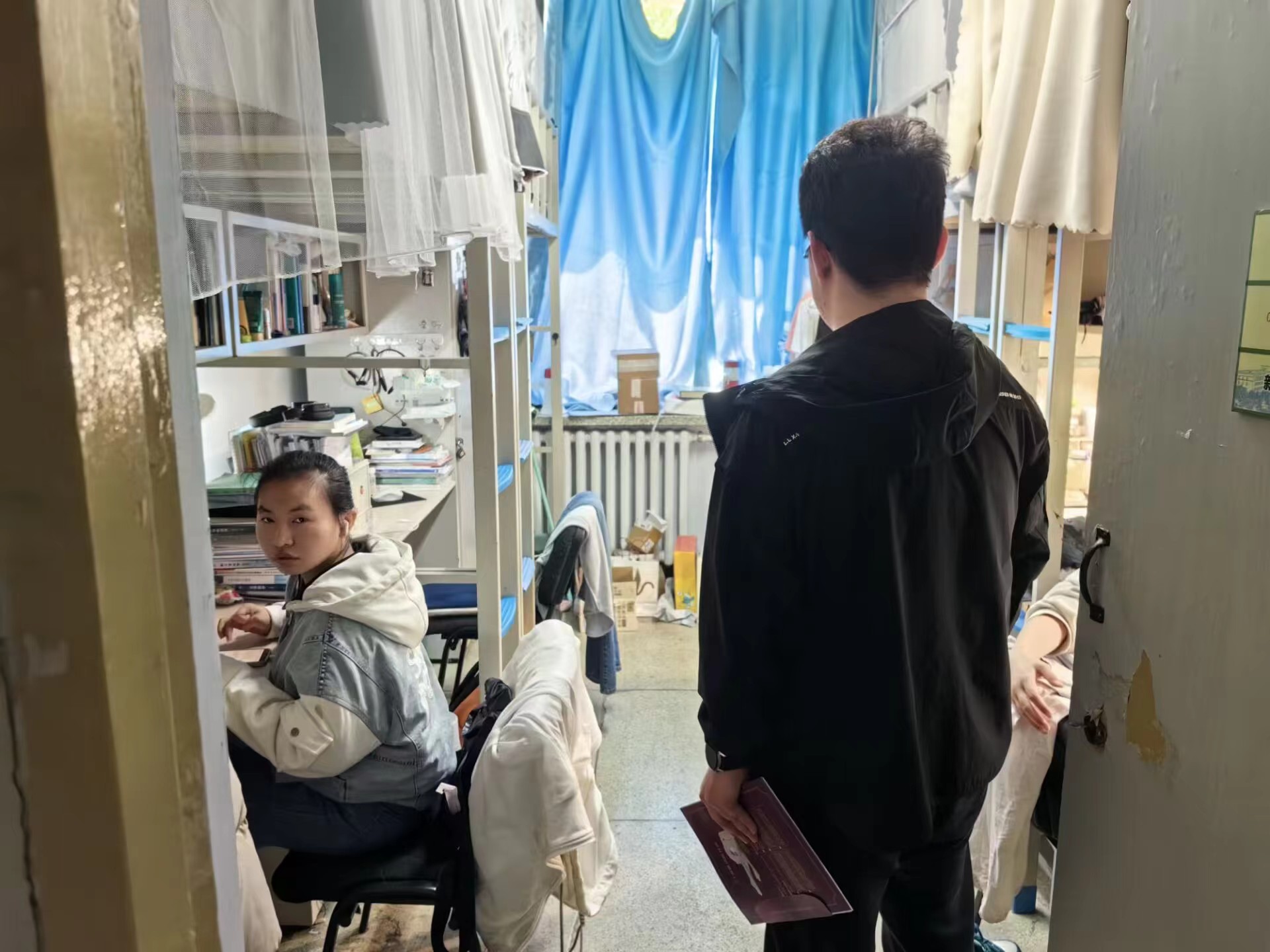 本周为春季学期第十四个教学周,学生工作办公室全体成员对两个校区的四所学生公寓进行安全卫生检查,检查楼宇包括中心校区南苑一公寓、南苑二公寓、朝阳校区五公寓、七公寓,共覆盖120间学生寝室,学生公寓本周安全卫生检查情况附后。本次检查中女生寝室卫生情况整体优于男生寝室,没有发现违章电器情况。本周降雨不断,检查过程中各位老师嘱咐同学们及时加衣注意保暖,为即将到来的期末考试做好准备。