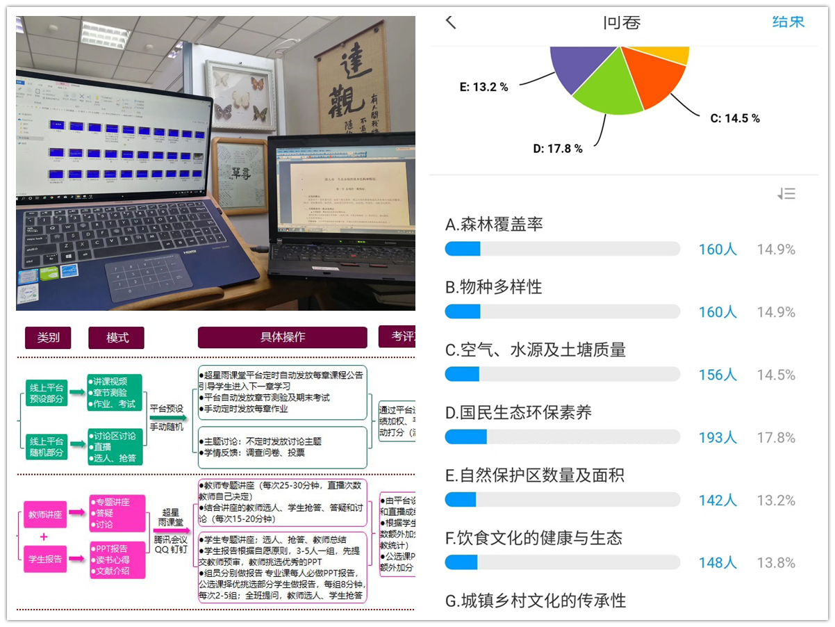 老师们经过短期的高强度培训学习,克服了诸多困难。因疫情防控的限制,老师们无法随时到办公室收集制作上课材料;一些老师家里孩子尚小,他们在家仍要承担监护和家务的责任,这些教学准备工作只能在深夜进行,他们为了备课而通宵达旦。一些老师暂时放下了自然基金的和其它科研论文的撰写,为了备课他们征用了家里唯一一台电脑,把自家小孩学校的网课学习排在了第二位,为了避免学校网络资源限制,他们甚至自费购买了流量包和所需课件,只为保证教学的顺利开展。