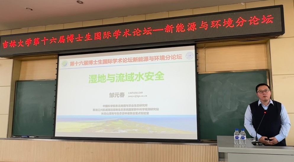 中国科学院东北地理与农业生态研究所研究员邹元春专家以《湿地与流域水安全》作特邀报告。邹元春研究员针对三处东北地区代表性流域的生态文明建设,明确了以“水生态保护”的国家需求,指出位于陆地和水生生态系统交错带的湿地对水安全的重要性,认为科研应从价值链到力量链,向大家传递了“研以致用、用以报国”的思想。