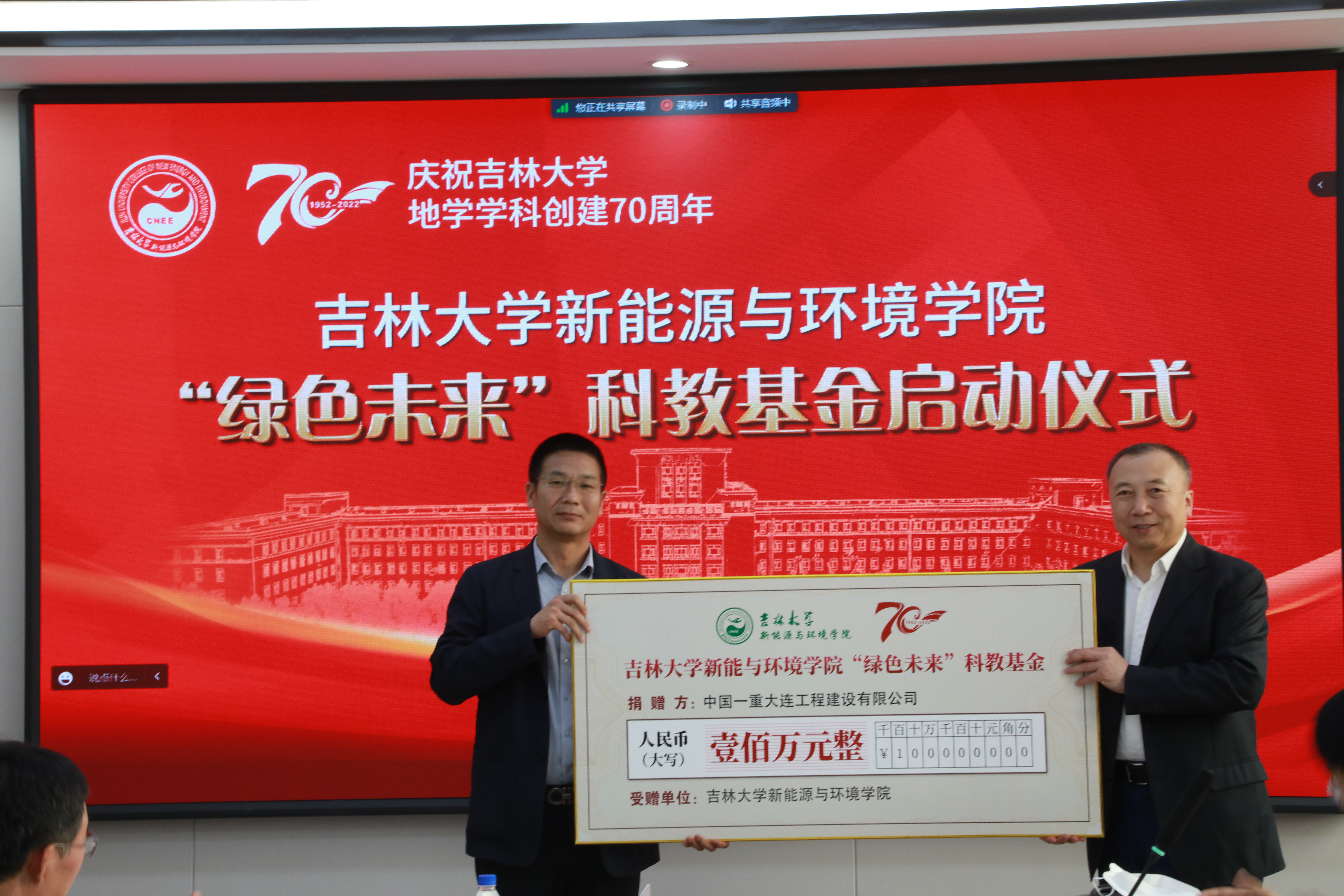 地学学科暨原长春地质学院创建70周年庆祝大会,学院举办系列庆祝活动,全院师生员工、海内外校友和关心学院发展的各界人士相聚线下线上,齐襄盛典,畅叙师生情谊,回顾了70年来学院在人才培养、科学研究、社会服务、文化传承创新和国际交流合作等方面取得的丰硕成果。以此为契机,学院校友捐赠设立“绿色未来”科教基金,举行了科教基金启动仪式。该基金将用于奖助学金、优秀人才培养等。