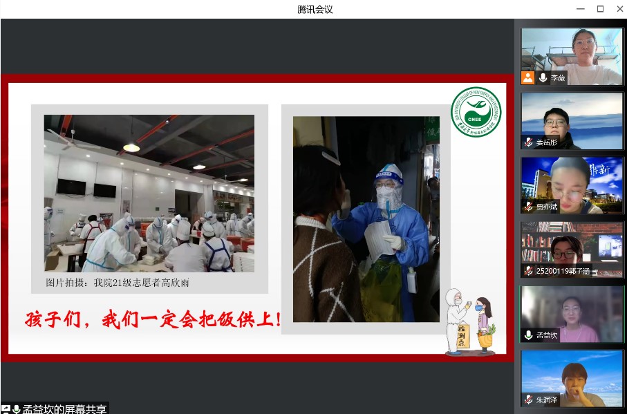活动伊始,党支部组织委员兼宣传委员牛梦圆同学带领大家一起学习了《致全省各级党组织和广大共产党员的一封信》以及《致全校各级党组织和广大党员的倡议书》。随后,四位党员志愿者代表分别分享了自己的战疫故事。孟益坎同学向大家展示了几组图片,讲述了自己从看到老师同学们积极参与疫情防控到自己和室友们一起参与防控的故事,分享了自己在清晨为大家发放完早餐后获得的自豪和光荣。她用“聚是一团火,散是满天星”形容一直奋战在校园疫情防控第一线的志愿者。一直驻校工作的钟宇博老师也分享了他这段时间的工作感受,他最后说“我们终会在春暖花开的校园里,迎接无码流出