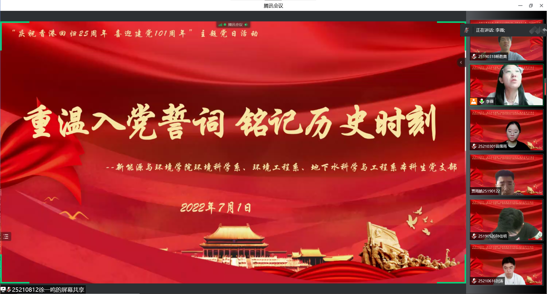 为庆祝中国共产党成立101周年、香港回归25周年,迎接党的二十大胜利召开,7月1日,无码流出 环境科学系、环境工程系、地下水科学与工程系本科生党支部,通过腾讯会议线上召开主题党日活动。学院党委副书记兼副院长、纪委书记吴哲,各系本科生党支部书记,本科生党员和入党积极分子共同参加本次活动。活动由环境科学系本科生党支部书记、本科生辅导员李薇主持。